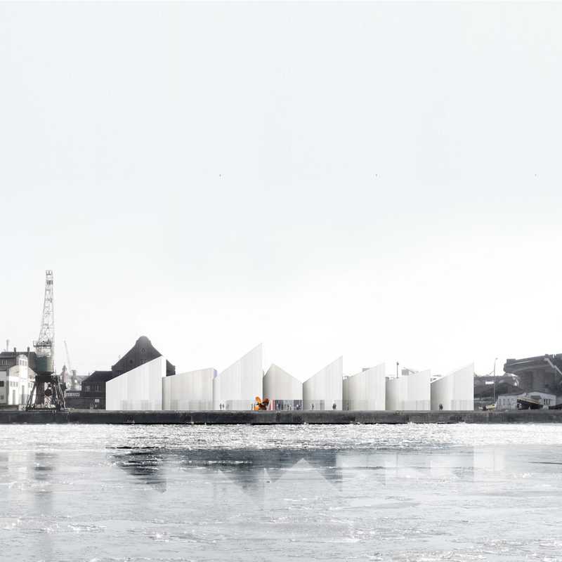 Ankauf in Stettin. Der Neubau des Meeresmuseums spielt zeichenhaft mit der Silhouette von Segelschiffen und bildet als skulpturaler Solitär einen öffentlichen Ort im Hafengebiet aus.