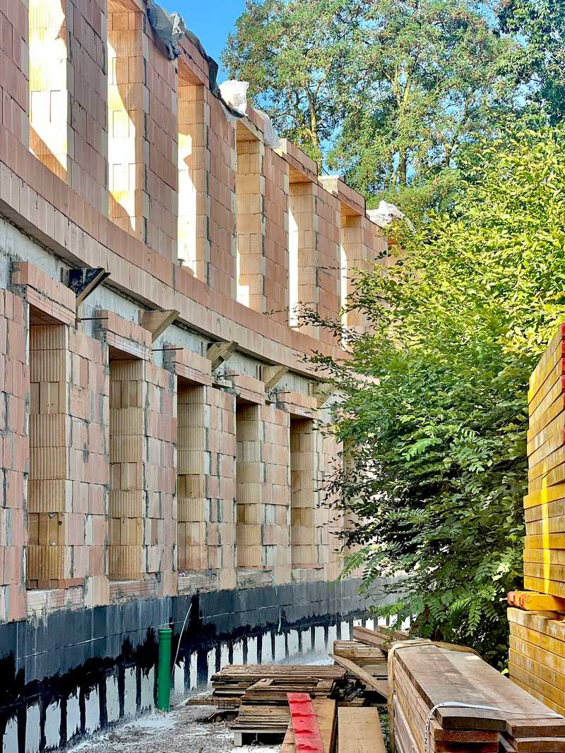 Der Rohbau des Erdgeschosses ist fast fertig. Die geschwungene Kubatur des Neubaus fügt sich harmonisch in die bestehende Architektur der Villa Berger ein.