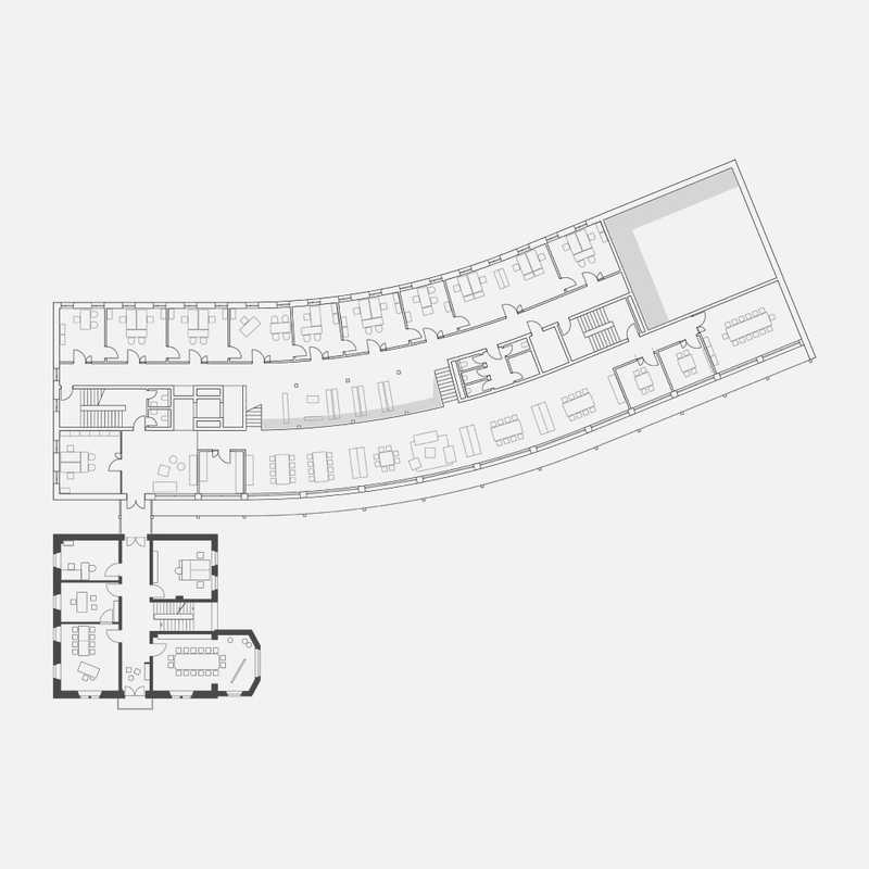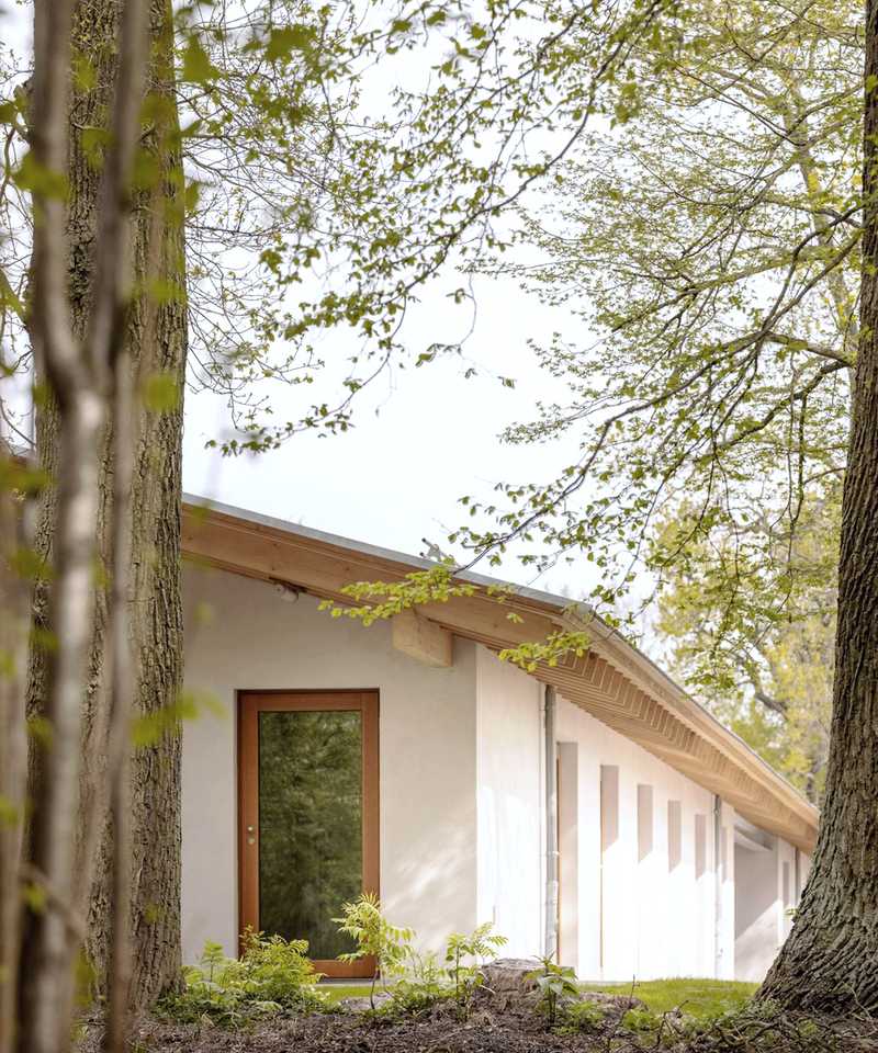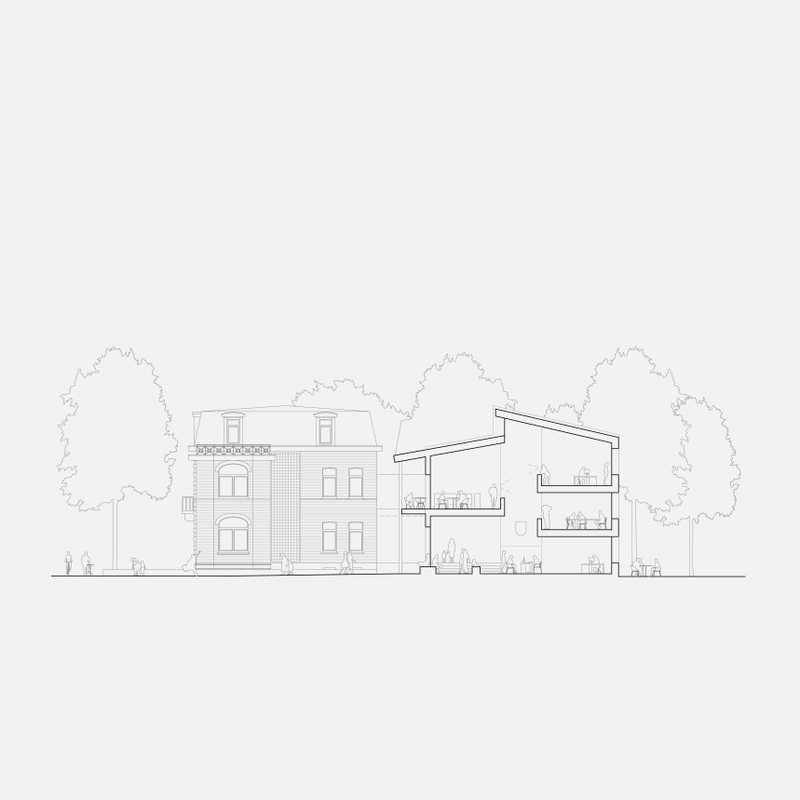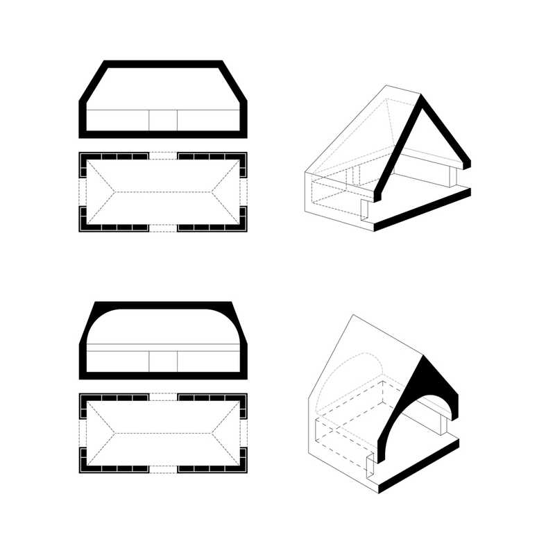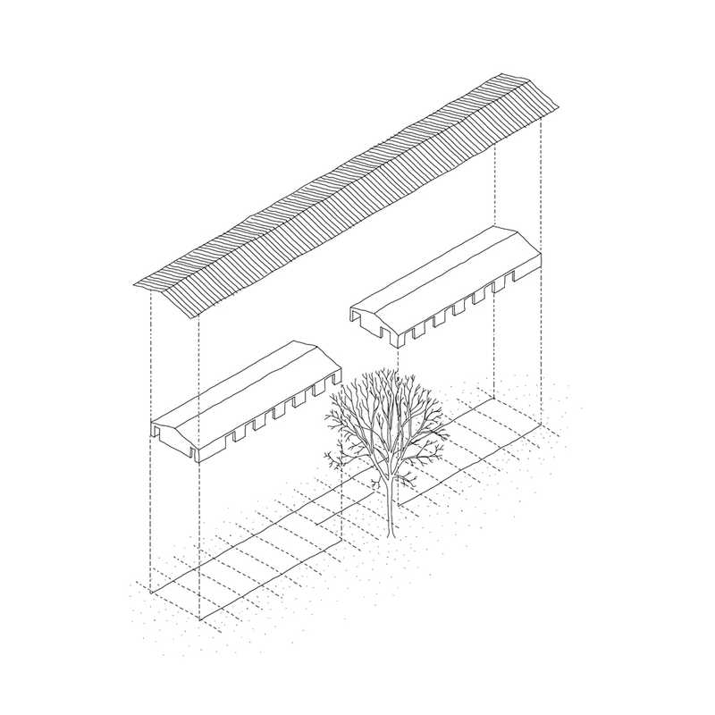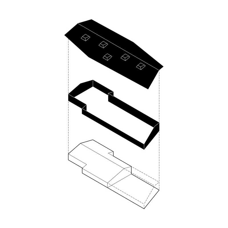 Ein gemeinsames Dach verbindet Neues und Altes symbiotisch zu einer Einheit. Die Verschiebung der Volumen schafft durch die resultierende Auskragung des Daches einen zwischen Innen- und Außenraum, zwischen Landschaft und Architektur, Kultur und Natur.