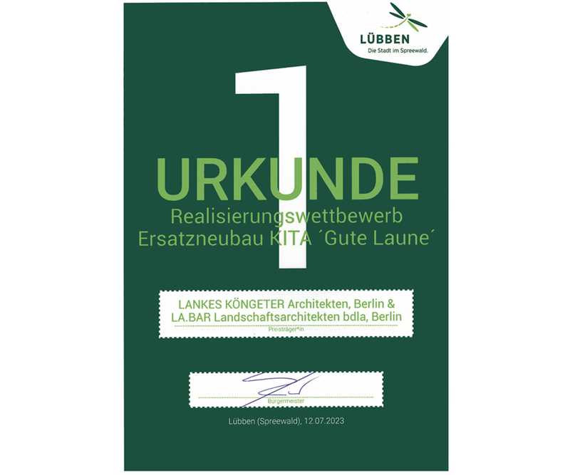 1.Preis, Neubau Quartierstreff und Kita "Gute Laune" in Lübben. Zwischen Wohnquartier und Kleingartenanlage, Stadtraum und Naturraum. Zwei verschränkte Baukörper schaffen einen neuen öffentlichen Raum für den Stadtteil Nord und für Lübben. Ein multifunktional nutzbarer Platz als Adresse für Kita und Quartierszentrum.