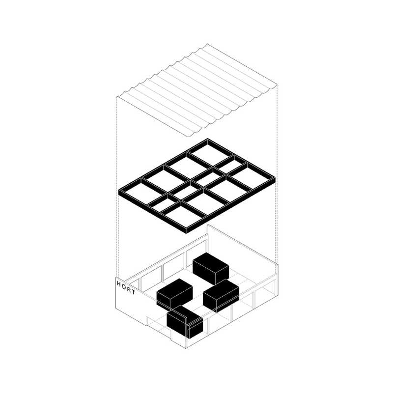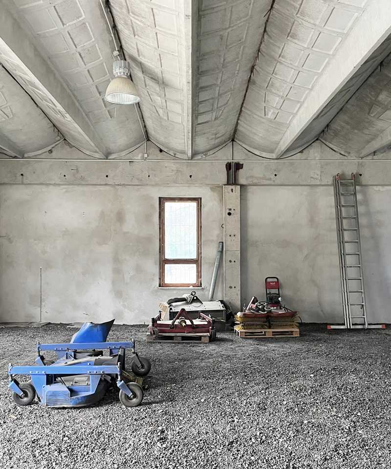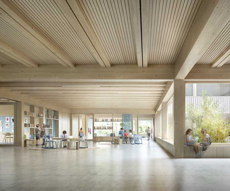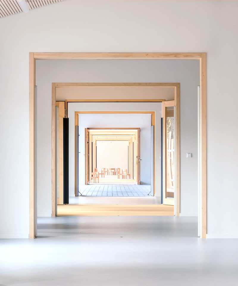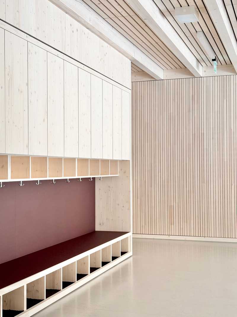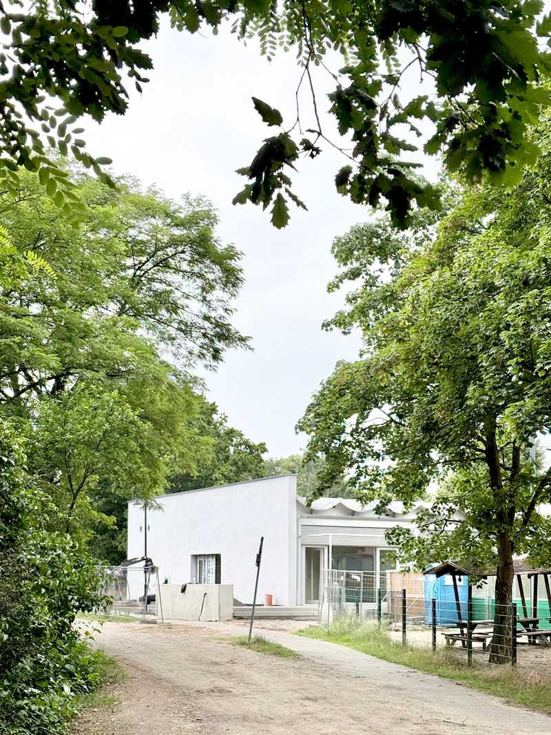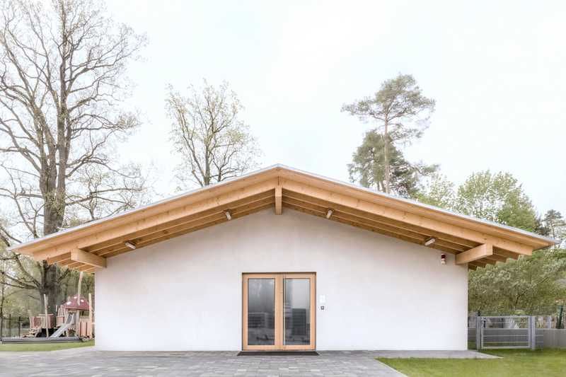 Umnutzung einer Typenhalle zu einer Kita in Perwenitz - Havelland. Großzügige Einschnitte in die Bestandsstruktur lassen Licht tief in den Innenraum des Bestandsgebäudes fallen. Ein modularer Holzbaukörper, als „Box-in-the box“ konzipiert, nimmt die künftigen Funktionen auf.