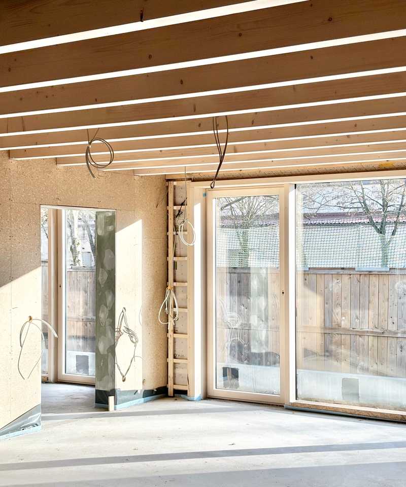 Rohbau- und Zimmererarbeiten sind abgeschlossen, die Kita nimmt Form an. Der neue Einbau fügt sich harmonisch in den Bestand. Die warme Atmosphäre des Holzes sorgt für eine einladende und behagliche Umgebung für die späteren Nutzer.